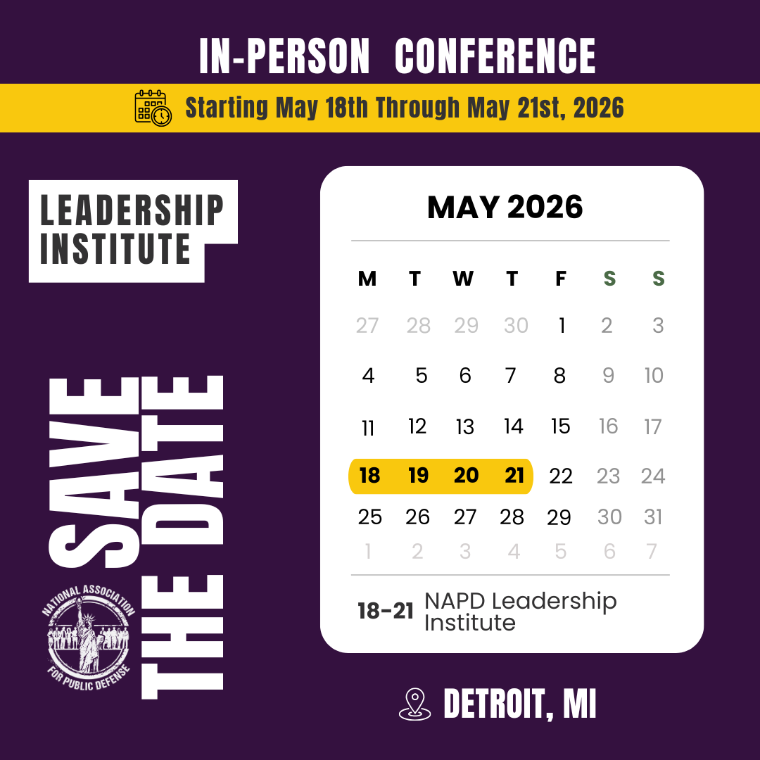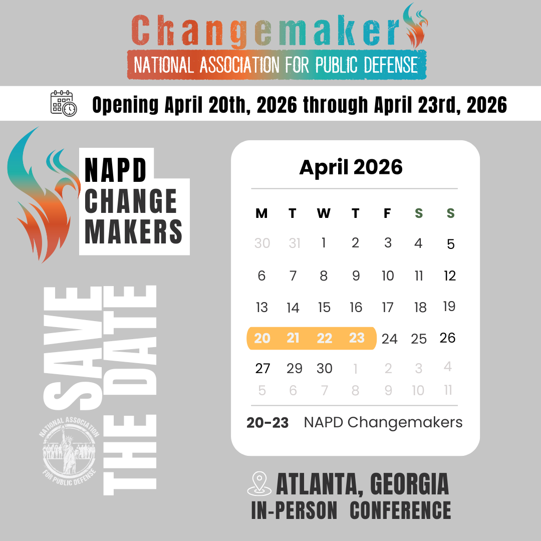 Save the date (March 19-20, 2026) for NAPD's upcoming Rise. Resist. Represent. Virtual Conference! This is NAPD's largest annual conference intended for all public defense professionals in all practice areas! We'll see you there. Stay tuned for registration!