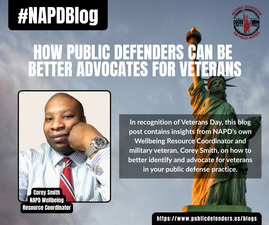 • In recognition of Veterans Day, below are insights from NAPD’s own Wellbeing Resource Coordinator and military veteran, Corey Smith, on how to better identify and advocate for veterans in your public defense practice.
