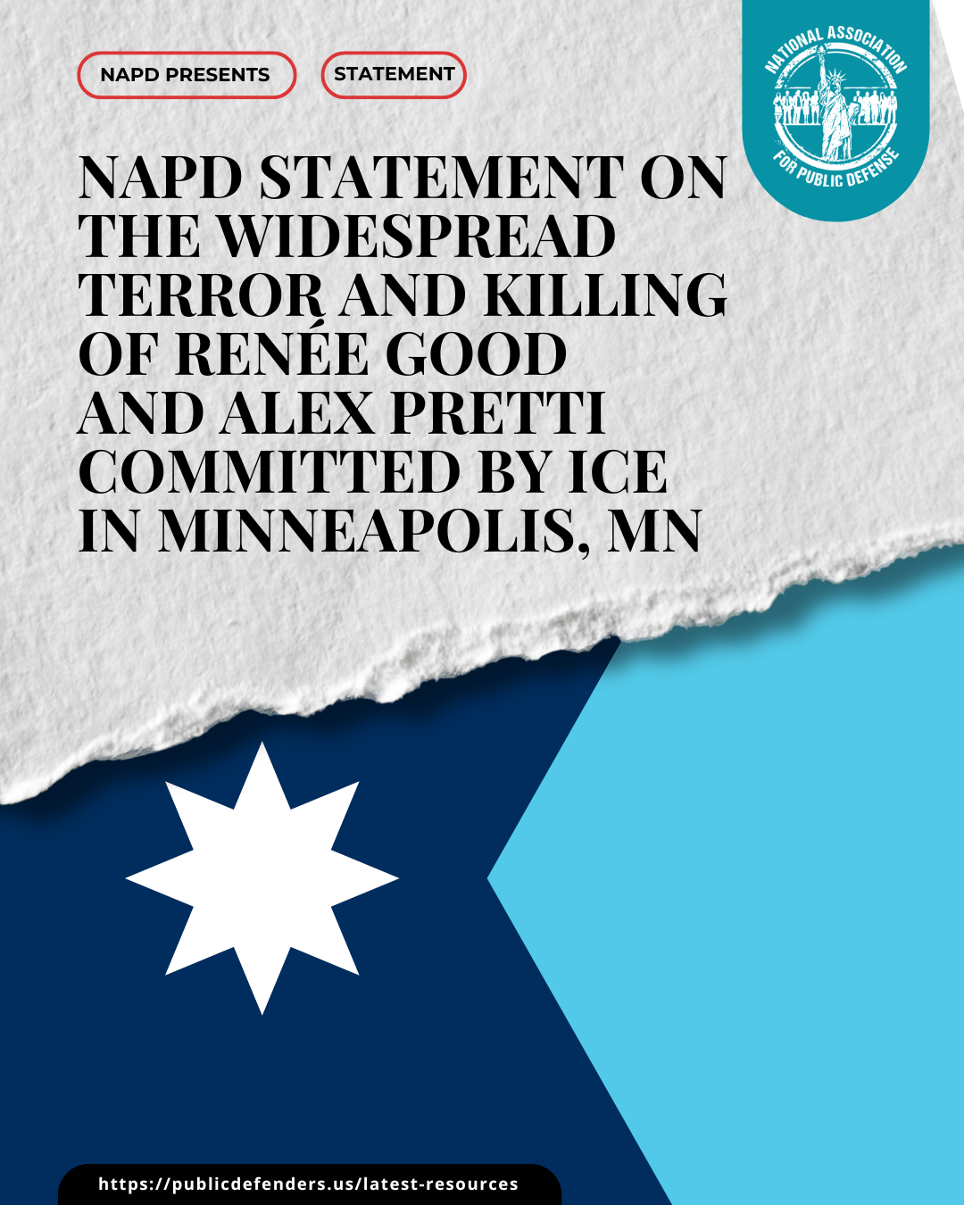 The National Association for Public Defense (NAPD) vehemently condemns the actions taken by federal immigration enforcement agents, including U.S. Immigration and Customs Enforcement (ICE) and U.S. Border Patrol, in Minneapolis, Minnesota, that resulted in the deaths of Renée Nicole Good on January 7, 2026, and Alex Jeffrey Pretti on January 24, 2026.